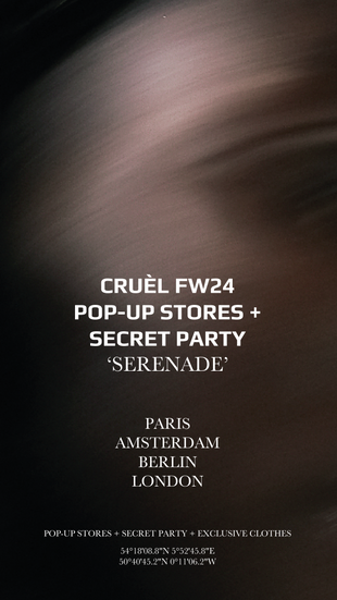 This is a limited and exclusive pop-up store & secret party event. For those who are fashion lovers and music enthusiasts and demand the best in life, the exclusive and limited CRUÈL FW24 Pop-Up Store and Secret Party event is for you. This will not be an ordinary Pop-Up Store & Secret Party event, but a ultimate block party with exclusive FW24 Clothes from our FW24 'SERENADE' runway tour collection, with a limited & exclusive stock, spectacular vibes, drinks and rage music.